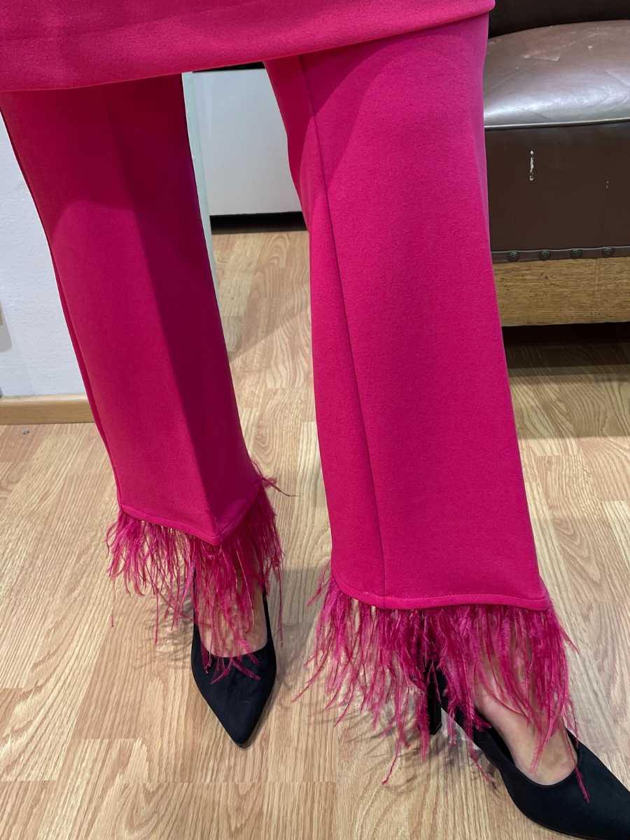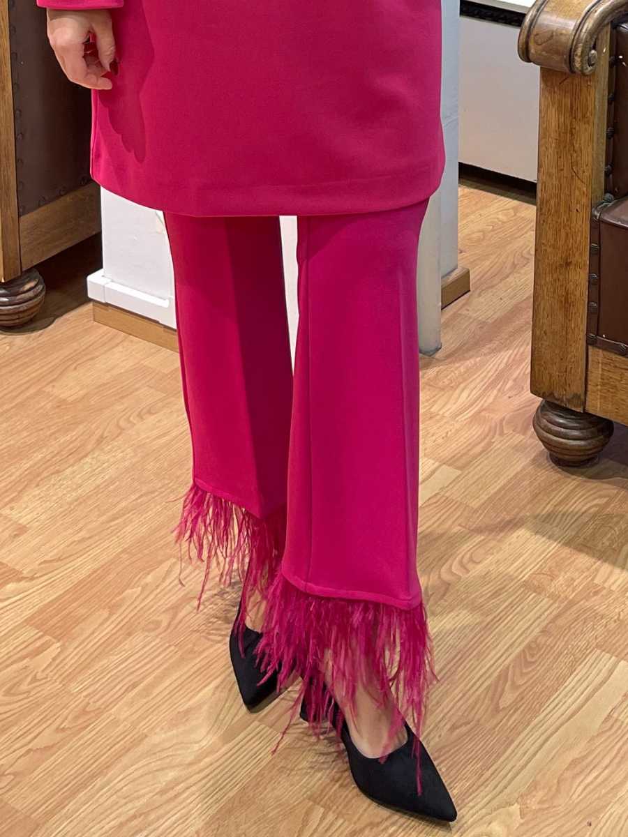 Katseet kääntyvät lahkeiden näyttäviin sulkakoristeisiin, jotka tuovat asuun leikkisyyttä ja juhlavuutta. Täydellinen valinta, kun haluat erottua tyylikkäästi – yhdistä saman sarjan tunikamekkoon tai yksinkertaiseen yläosaan luodaksesi elegantin kokonaisuuden.