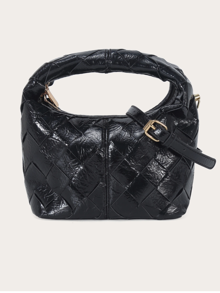 Pudottu laukku, joka on materiaaliltaan synteettistä nahkaa. Kiiltäväpintainen.