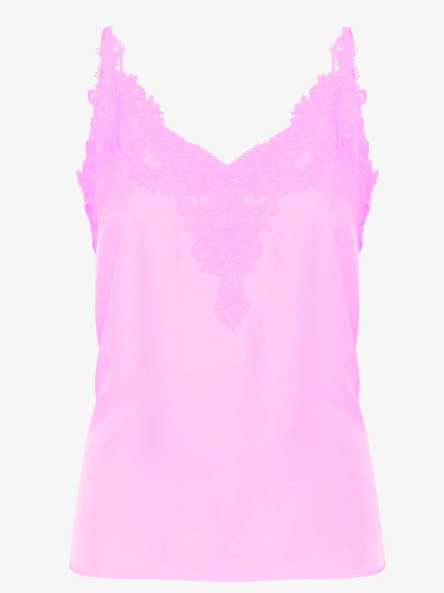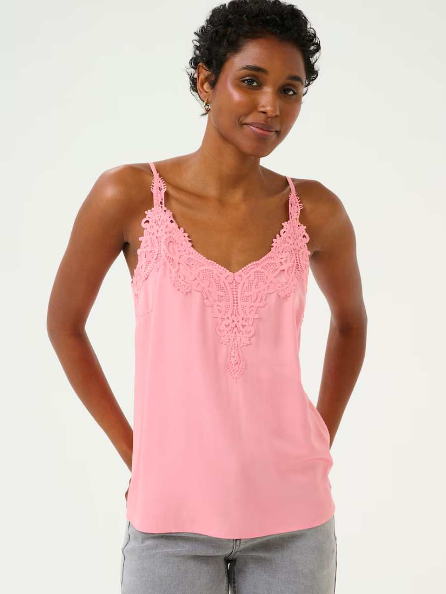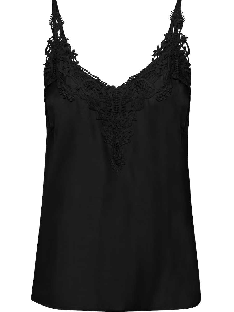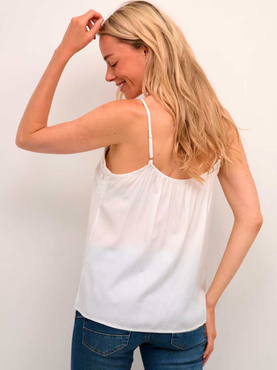Creamin Anna-toppi on todellinen vaatekaapin monikäyttöinen helmi! Tämä naisellinen toppi hurmaa kauniilla pitsiyksityiskohdilla ja kevyesti laskeutuvalla materiaalilla, joka yhdistää viskoosin pehmeyden ja polyesterin kestävyyden. V-pääntie ja ohuet, säädettävät olkaimet viimeistelevät elegantin ilmeen.