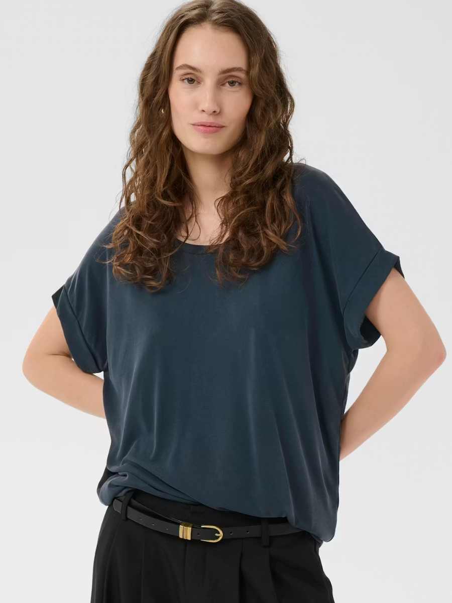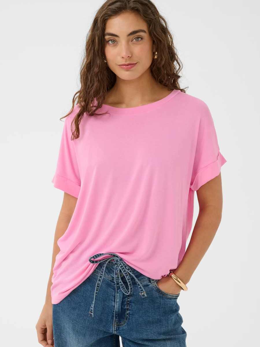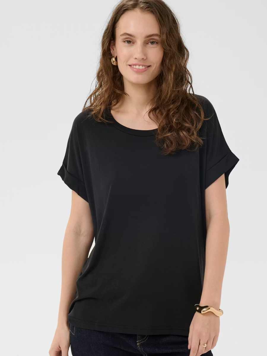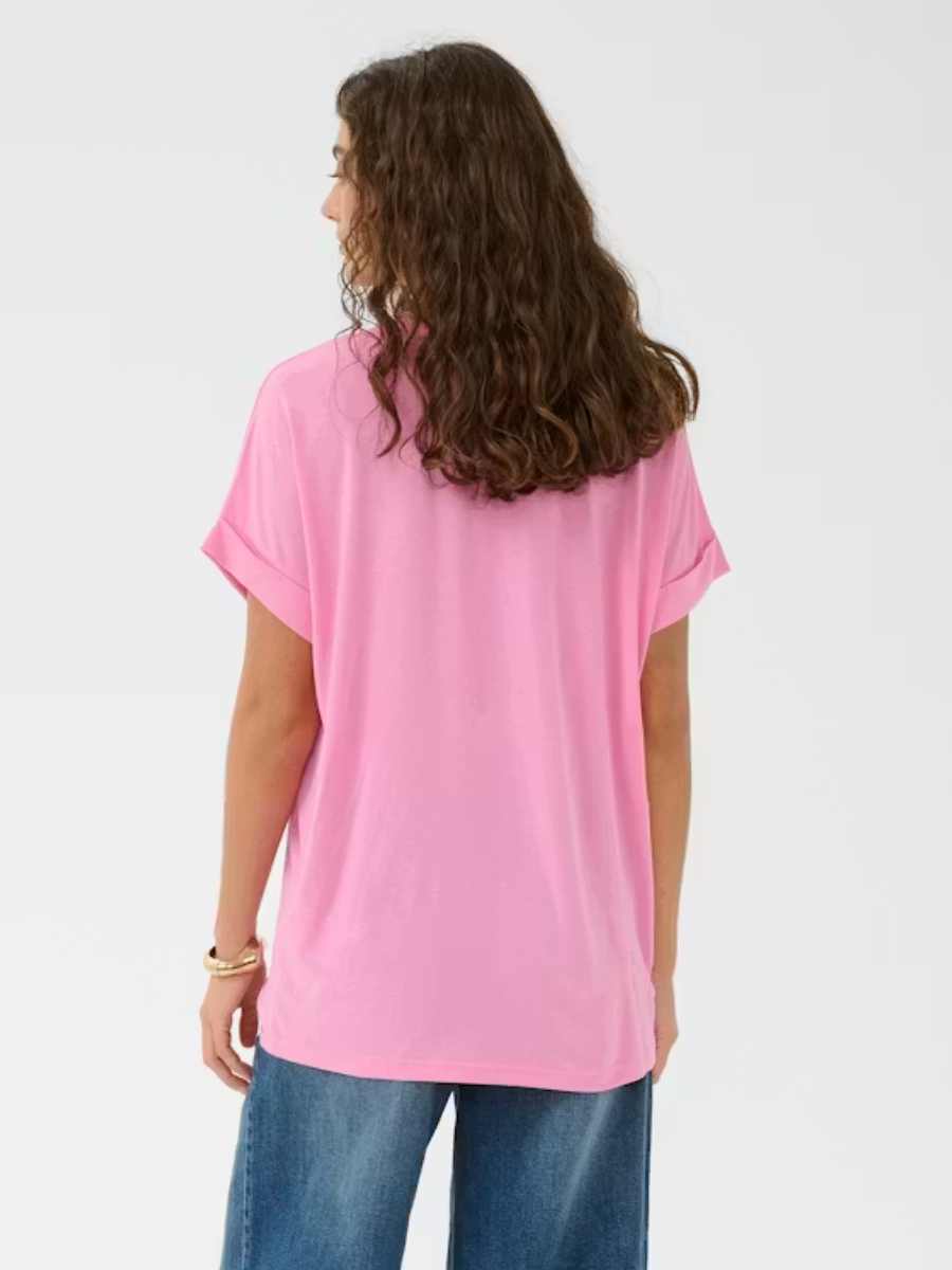 Tässä perus-T-paidassa on rento istuvuus, pehmeä materiaali ja klassinen pyöreä pääntie. Lyhyet käännetyt hihat ja lantion mittainen pituus tekevät siitä täydellisen monipuoliseen arkipukeutumiseen ja helppoon kerrospukeutumiseen.
