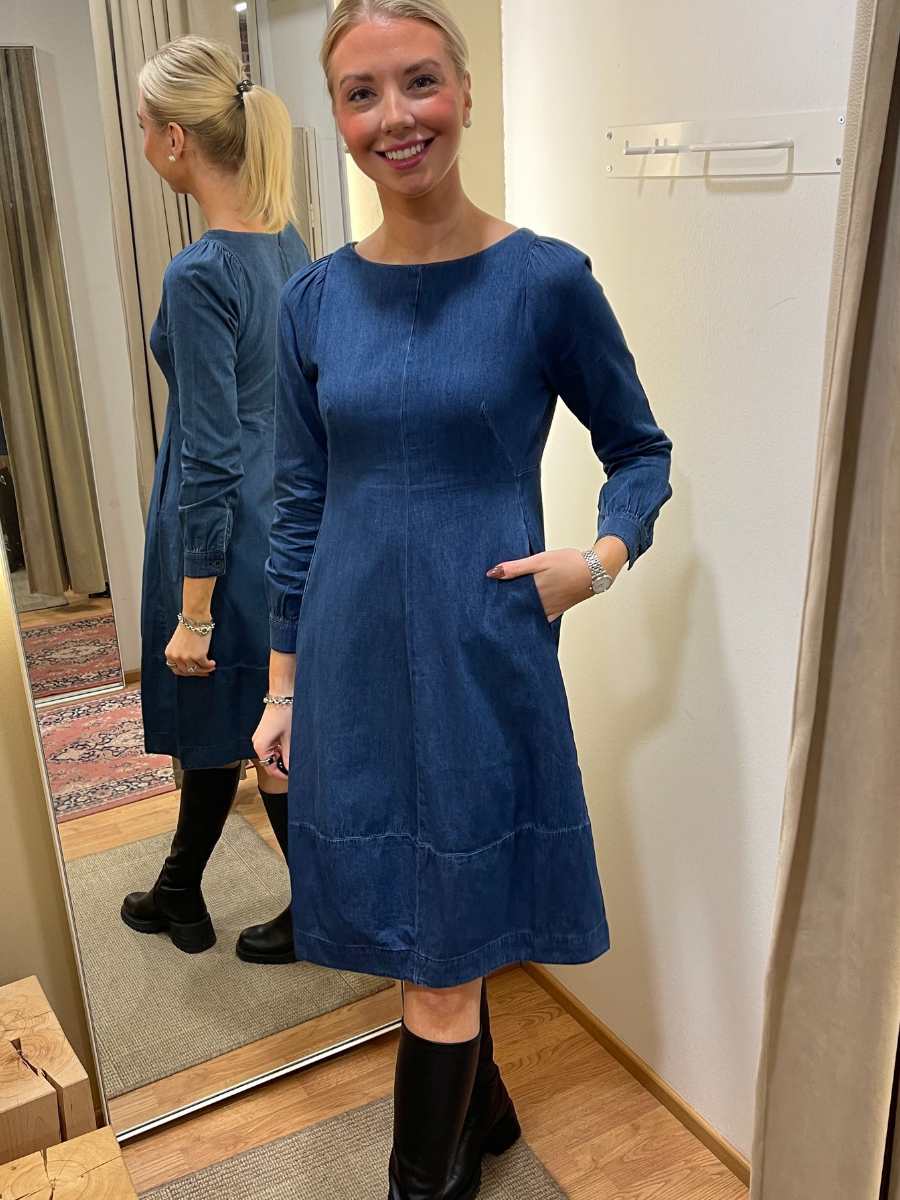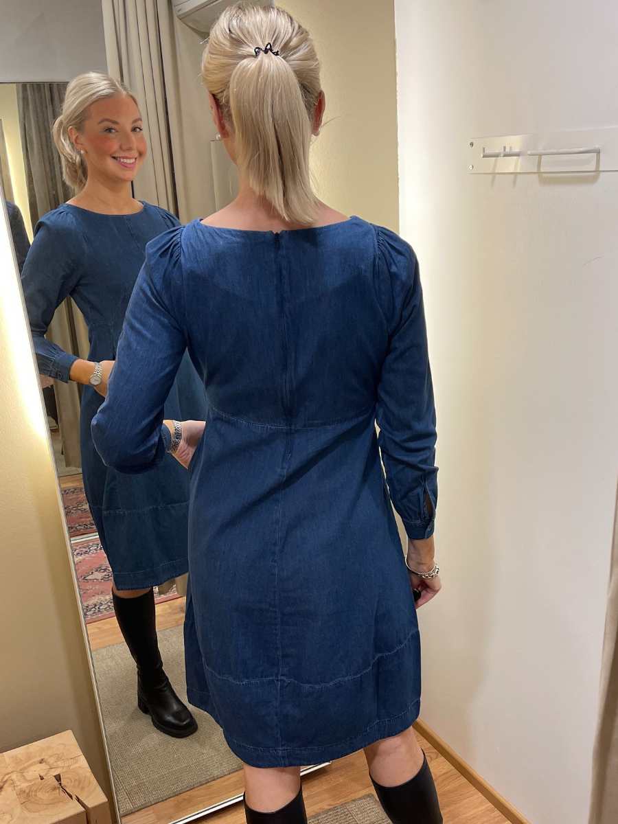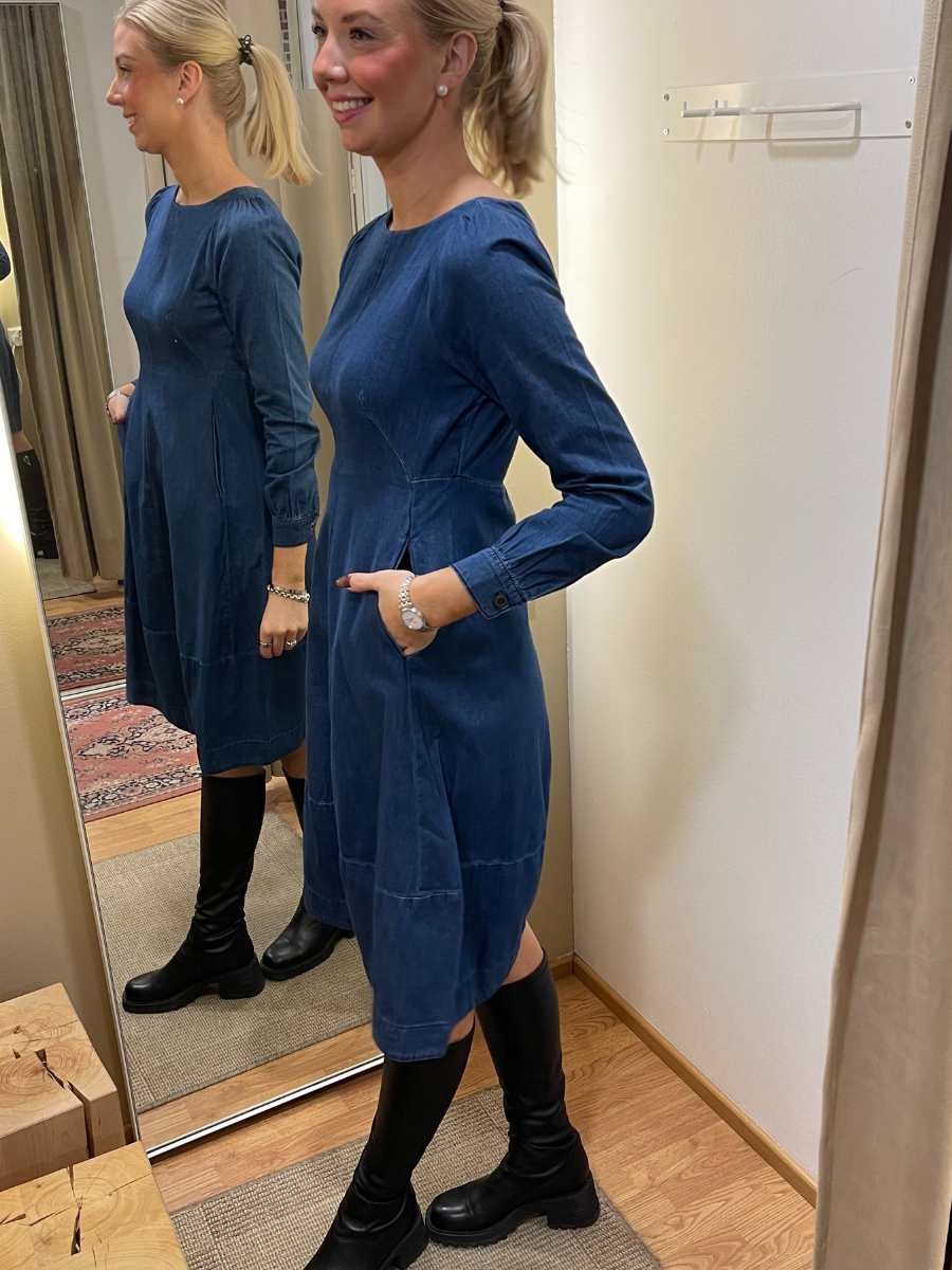 Mekossa on siro pyöreä pääntie, ja takana kulkeva vetoketju tekee pukemisesta helppoa. Leikkaus korostaa naisellista siluettia: yläosa istuu kauniisti ja vyötäröltä alkava kellohelma tuo mekkoon liikettä ja kepeää eleganssia. Hieman pussittuvat hihat ja sivutaskut lisäävät käytännöllisyyttä. Helppo mekko arkeen ja pieneen menoon!