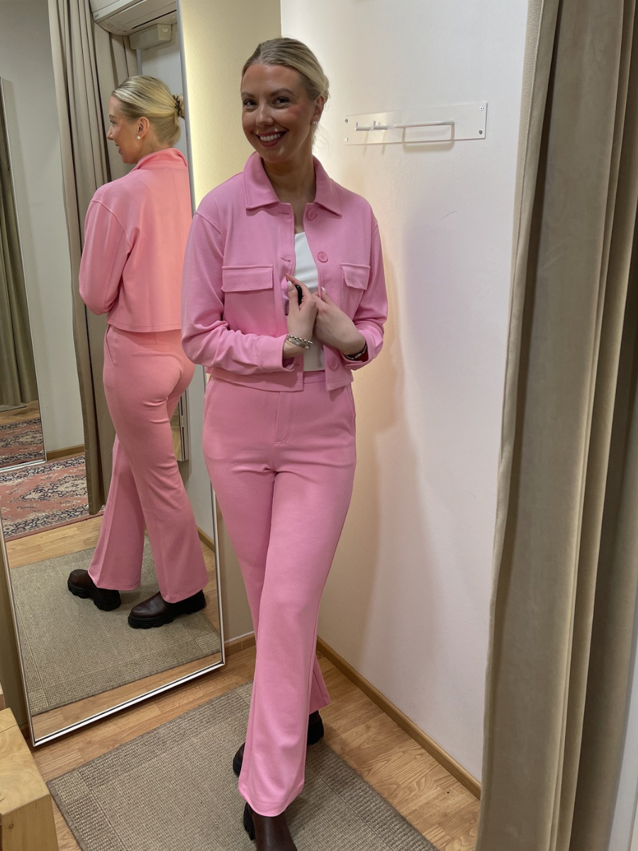 Ihanan pehmeät pinkit bootcut lahkeiset housut. Kuminauhavyötärö, vyörenksut, sivuilla taskut ja vetoketju litsit napilla.