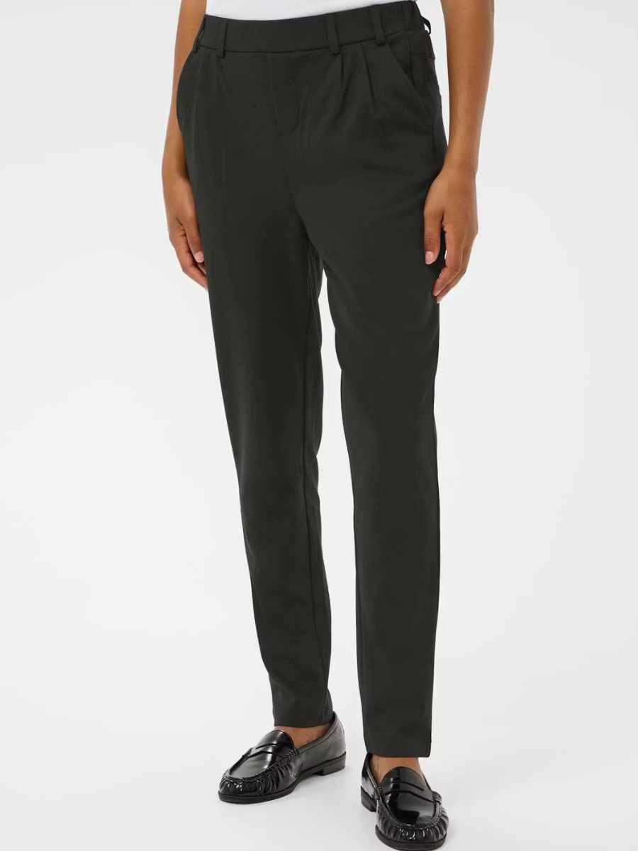 Kapenevat housut, joissa on etulaskokset, sileä vyötärönauha ja joustoa mukavuuden lisäämiseksi. Mallissa on sivutaskut, takana listataskut sekä kuminauha vyötärön takaosassa. Siisti ja joustava vaate arkeen sekä pieneen menoon.