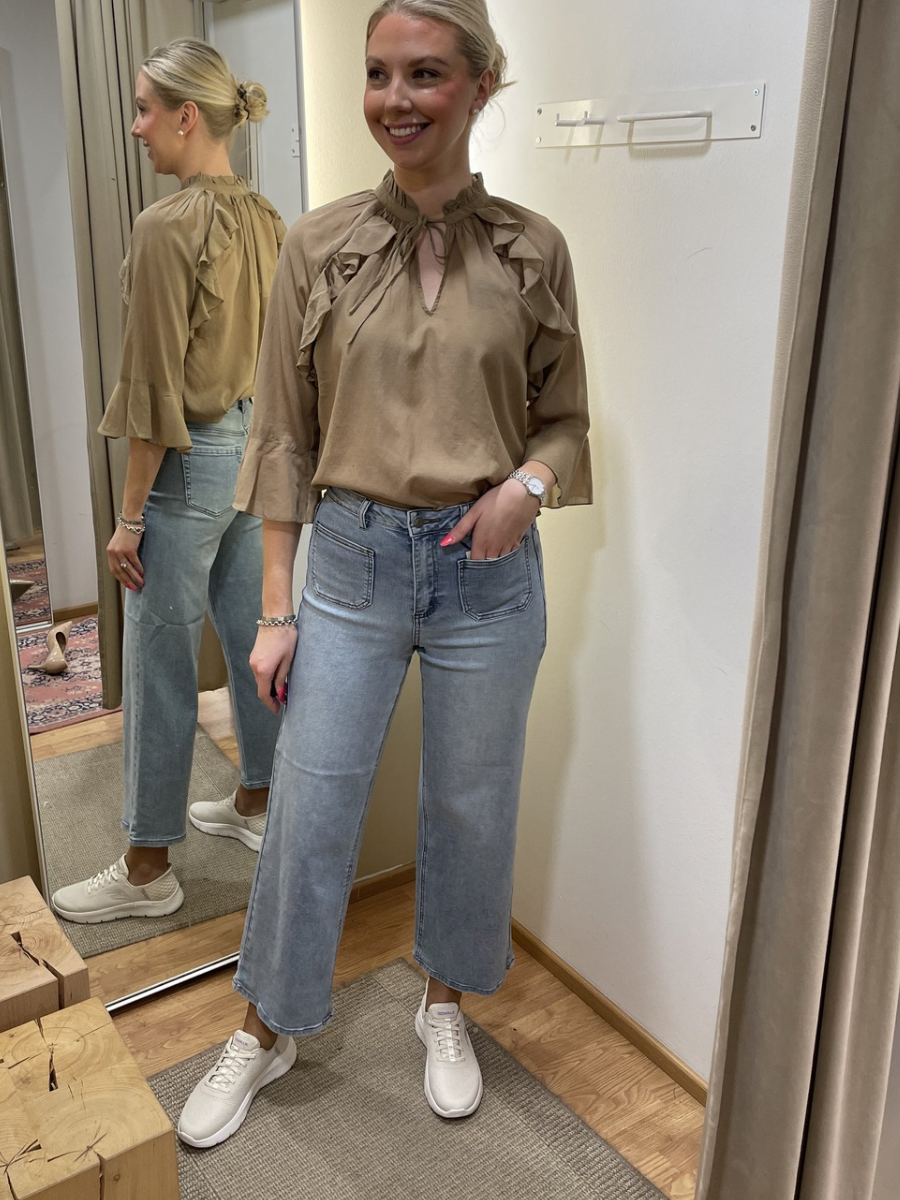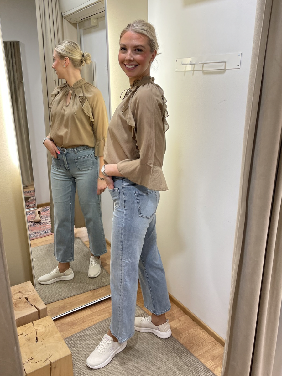 Kaffe Brook -farkut ovat tyylikkäät korkeavyötäröiset farkut, joissa on hillitysti levenevät lahkeet. Värinä keskisininen pesu. Pehmeä ja joustava stretch-denim tekee niistä mukavat käyttää koko päivän. Yläosa istuu napakasti ja imartelevasti, ja käytännöllisyyttä tuovat vetoketju- ja nappikiinnitys sekä vyölenkit. Klassiset etu- ja takataskut viimeistelevät kokonaisuuden. Täydellinen valinta naiselle, joka haluaa yhdistää mukavuuden ja huolitellun tyylin.