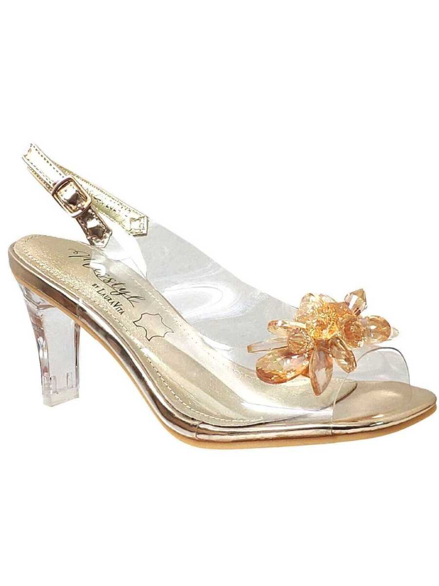 Laura Vitan suunnittelema Misstyl-mallisto hurmaa näyttävillä slingback-korkokengillä, jotka tuovat mieleen lasikengän keveyden ja eleganssin. Joustavasta muovimateriaalista valmistettu päällinen istuu jalkaan pehmeästi ja paljastaa kauniisti jalan muodon. Avoimen kärjen ylle on sijoitettu näyttävä koriste, joka koostuu eri muotoisista kimaltelevista kivistä ja luo kengille ylellisen ilmeen.