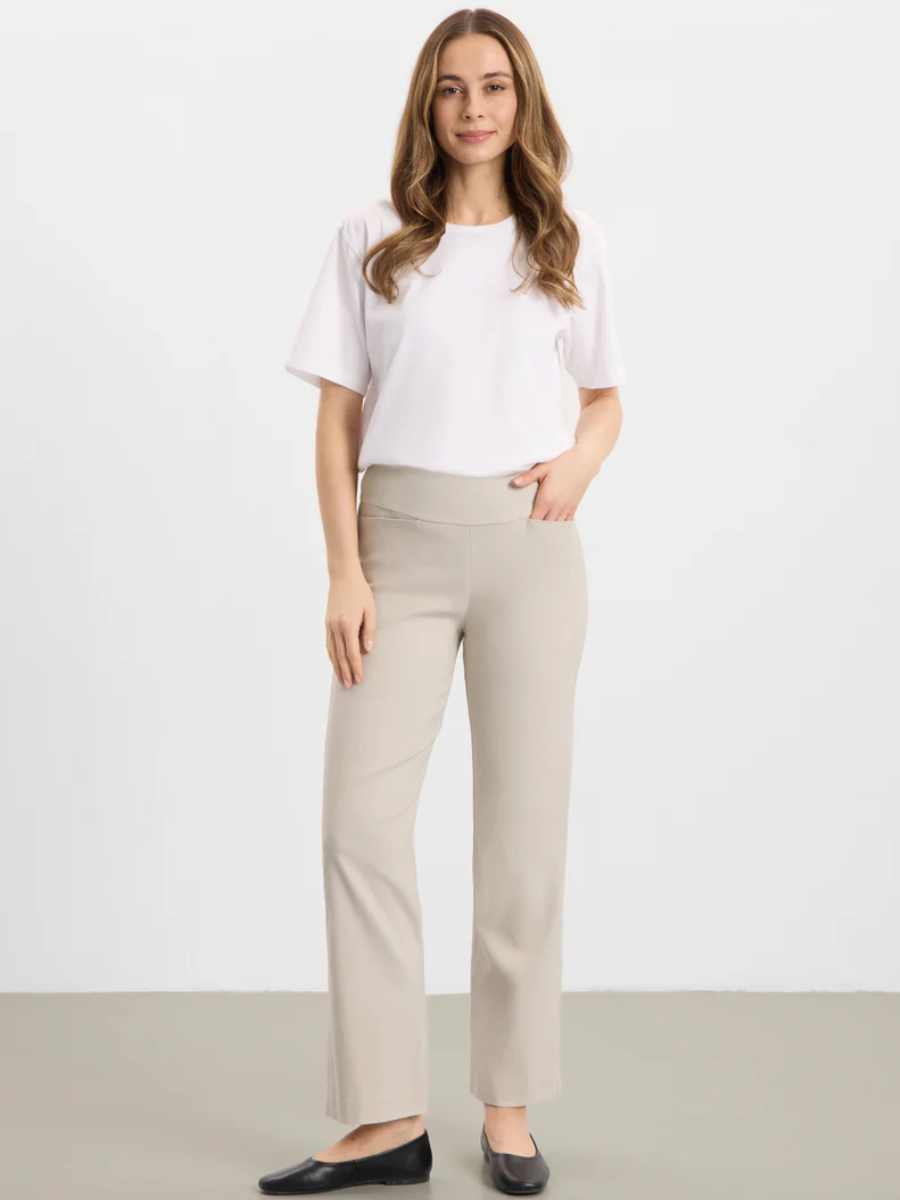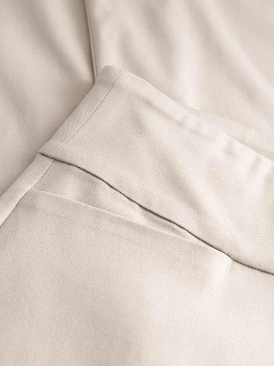 Housuissa on suora istuvuus ja korkea vyötärö. Vyötärö on joustavaa kuminauhaa. Edessä on taskut.