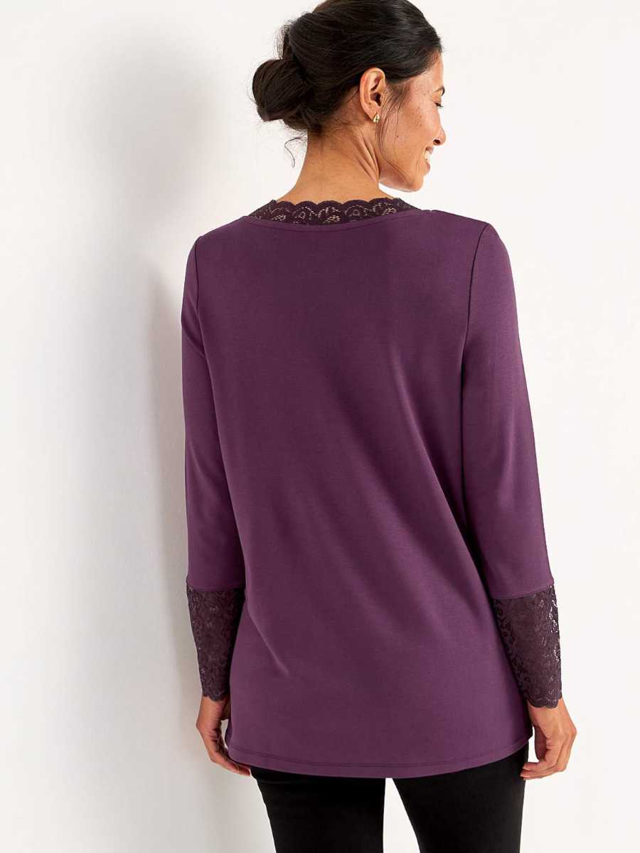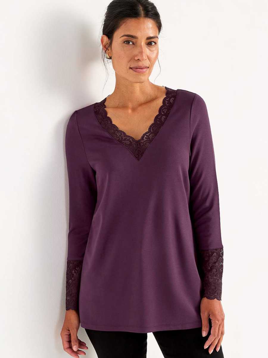 • Tunika pehmeästä viskoosisekoitteesta. • Normaali istuvuus. • Hieman a-linjainen malli. • Pääntie v-pääntiellä ja pitsillä. • Pitkät hihat leveällä pitsireunalla hihansuissa. • Suora helma. • Pituus olkapäältä koon mukaan noin 71-78 cm.