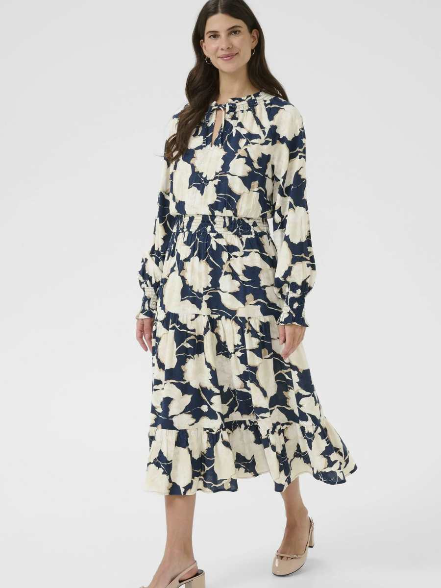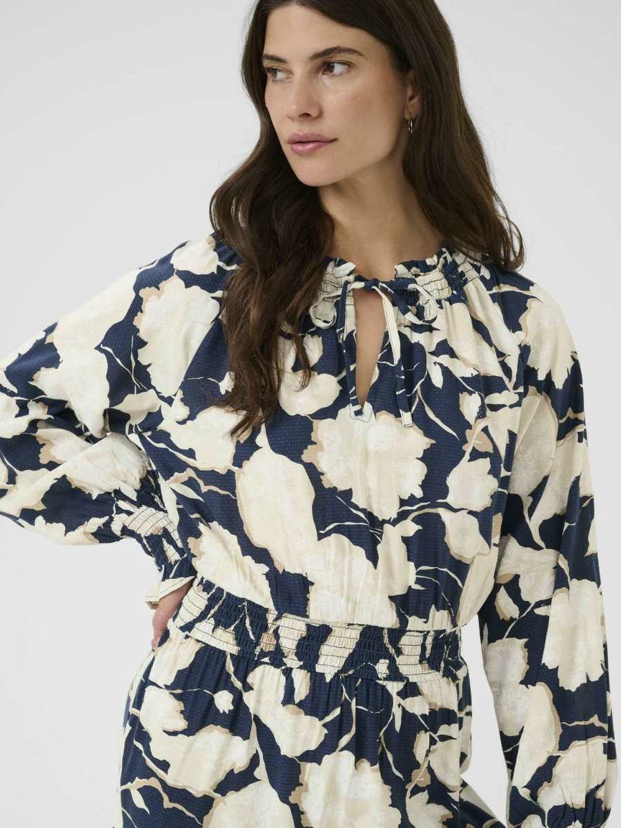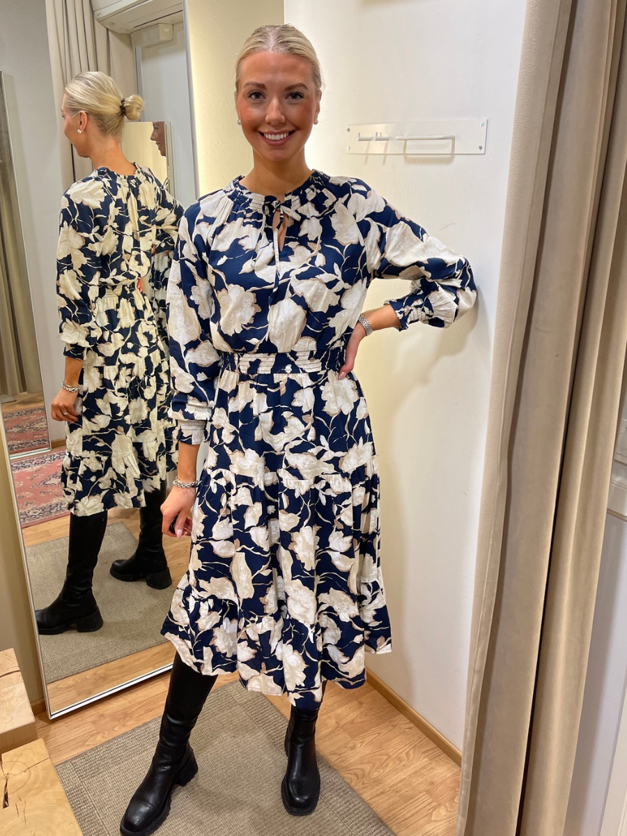 Pitkähihainen tummansininen mekko, jossa on vaalea kukkakuviointi. Vyötäröllä kuminauha ja helmassa frillaa. V-kaulus pääntie, jossa solmittavat nauhat. Hihojen suissa kuminauhat.