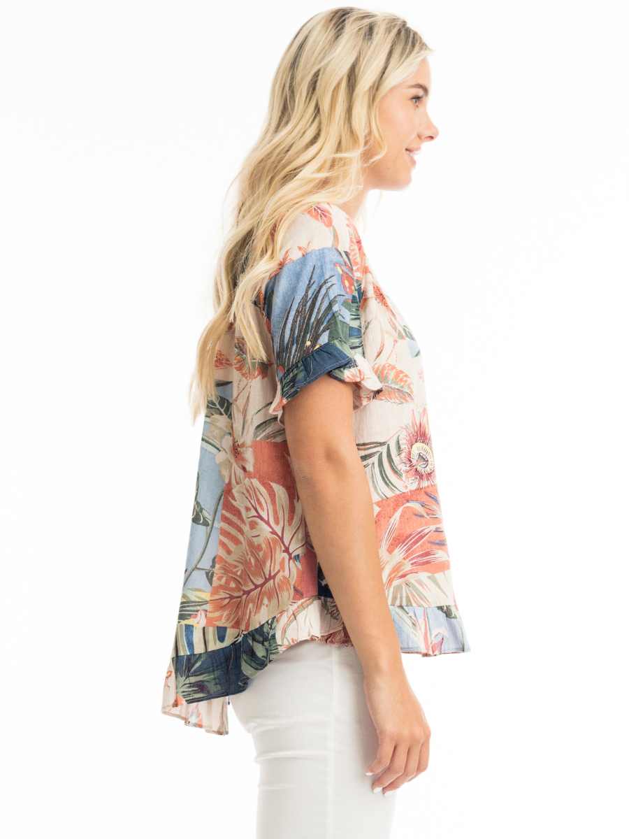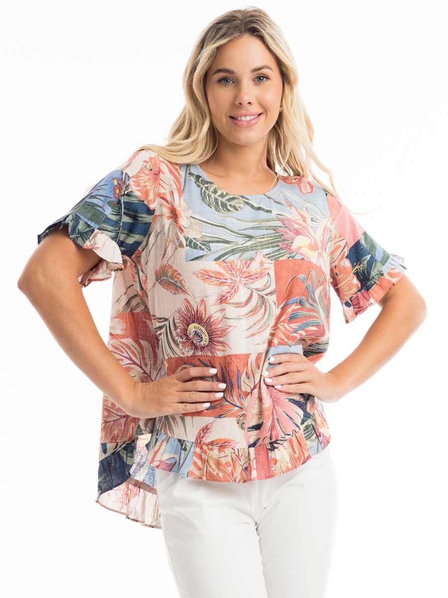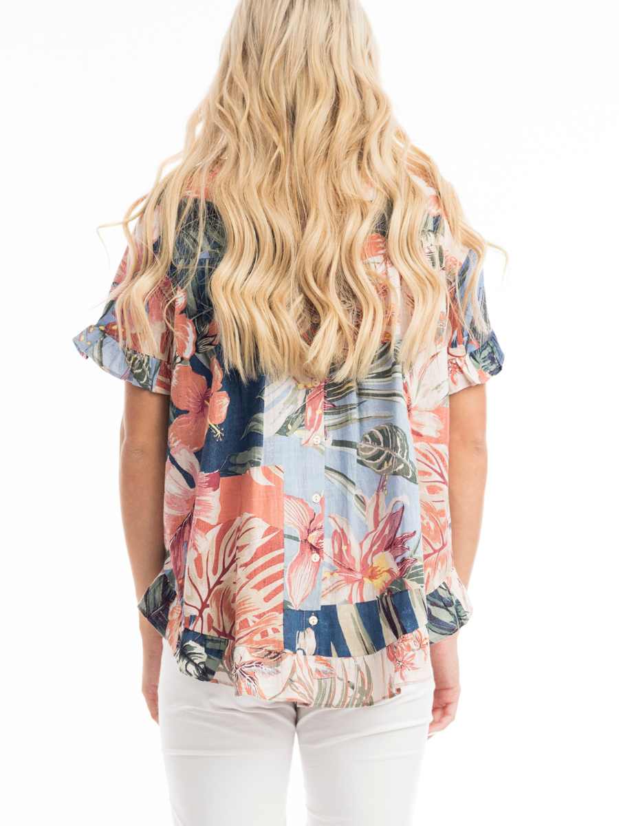 Tuo väriä ja raikasta tyyliä arkeesi tällä upealla Orientiquen puuvillapuserolla! Puserossa on näyttävä trooppishenkinen kukkakuosi, jossa yhdistyvät harmonisesti murretut sävyt – täydellinen valinta kesän rentoihin päiviin. Väljä leikkaus ja kevyesti laskeutuva kangas takaavat mukavuuden, kun taas frillayksityiskohdat hihoissa ja helmassa tuovat naisellista ilmettä.