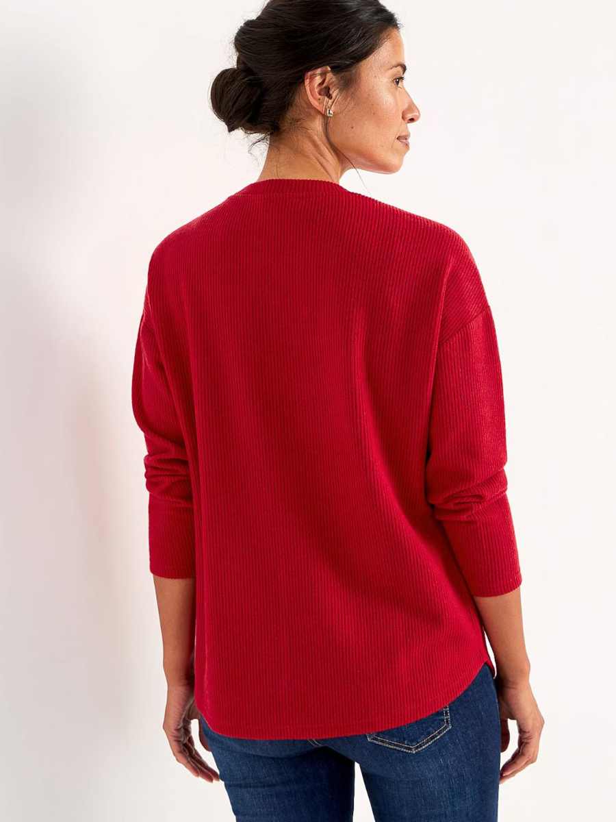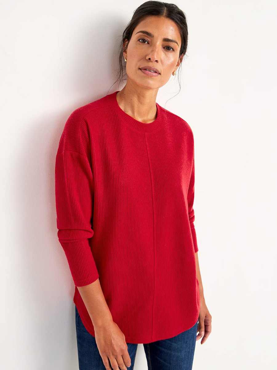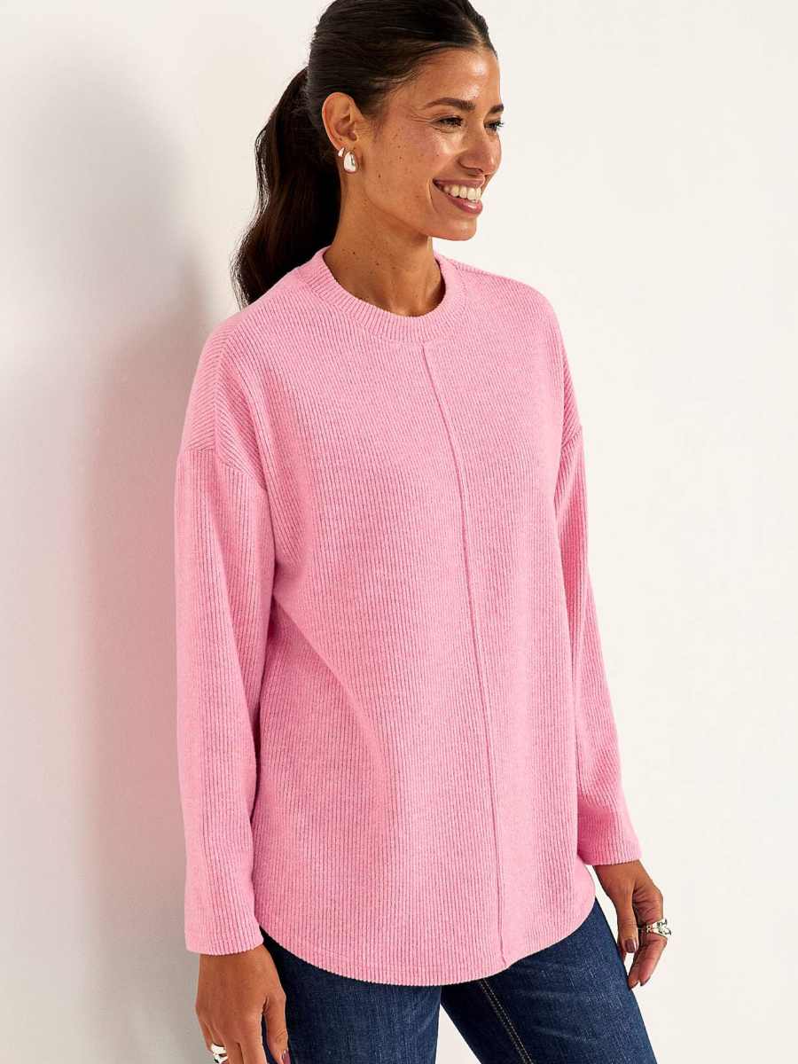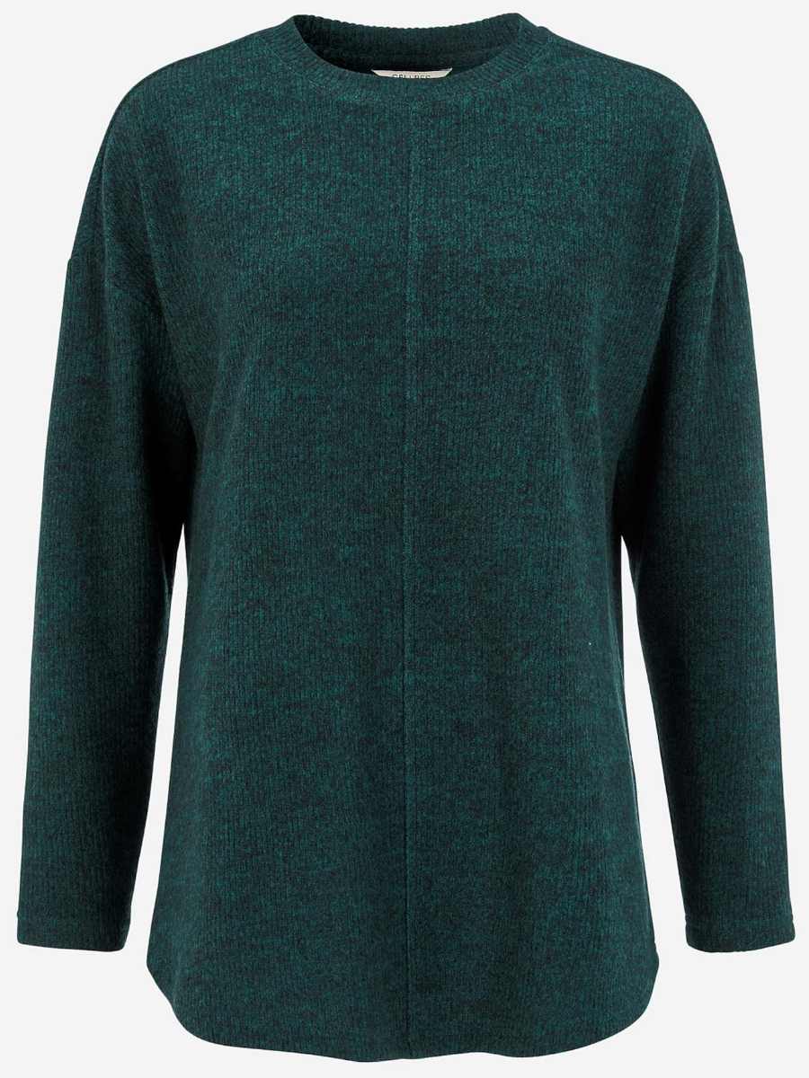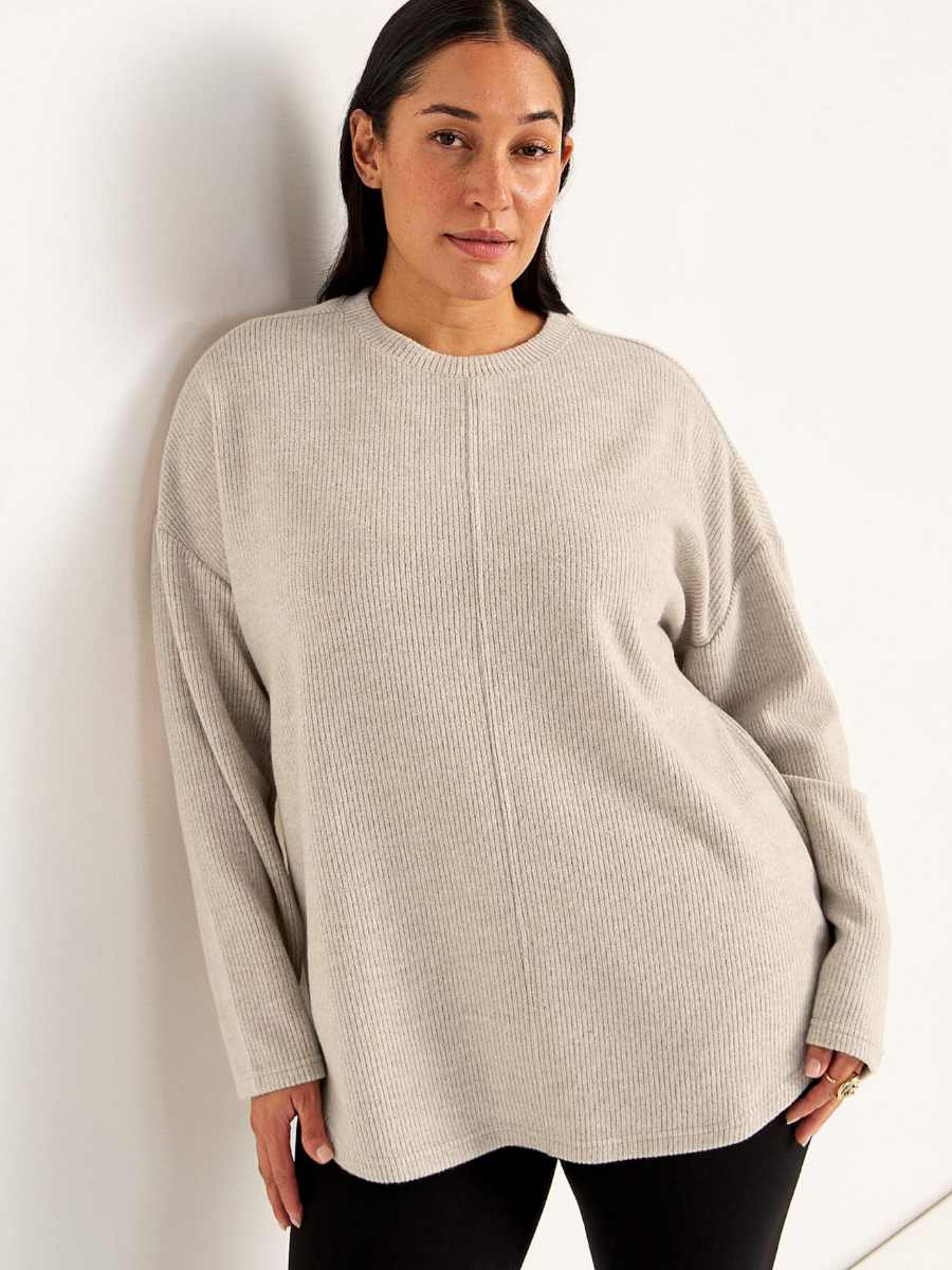 Pehmeä neulottu pusero, joka tuntuu miellyttävältä päällä. Joustava, ribattu materiaali harjatulla pinnalla tuo lämpöä ja mukavuutta. Suora istuvuus ja koristeellinen keskisauma antavat puserolle huolitellun ilmeen. Pyöreä pääntie, pitkät hihat ja pudotettu olkapää luovat rennon ja modernin siluetin. Pyöristetty helma viimeistelee kokonaisuuden. Pituus olkapäältä mitattuna on koosta riippuen noin 70–80 cm.