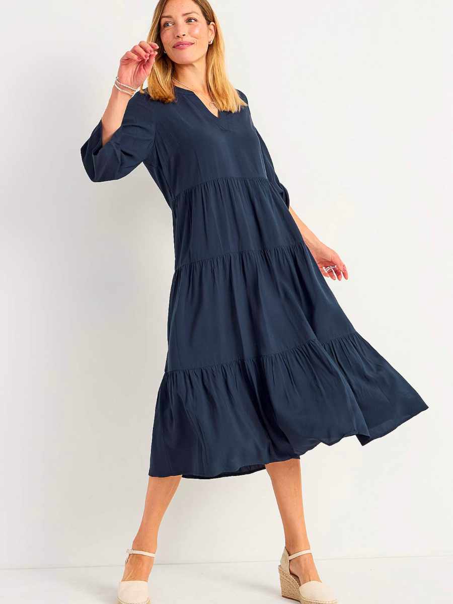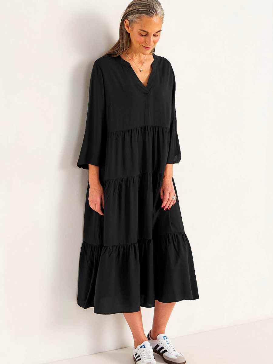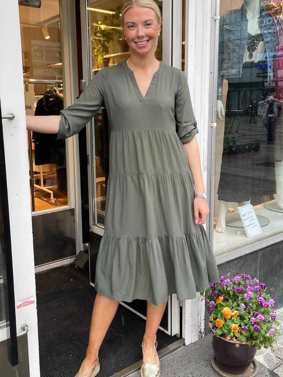 Tämä rento ja monikäyttöinen viskoosimekko on täydellinen valinta niin arkeen kuin rennompaan juhlaan. Mekossa on väljä istuvuus, kaunis V-pääntie ja näyttävä röyhelöhelma, joka tuo asuun keveyttä ja naisellisuutta. 3/4-hihat ja pehmeä viskoosikangas tekevät siitä miellyttävän käyttää koko päivän ajan.