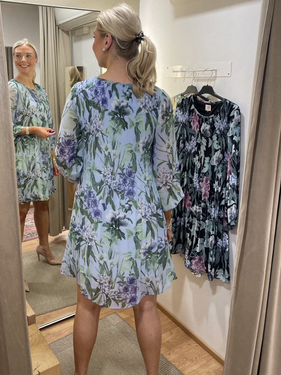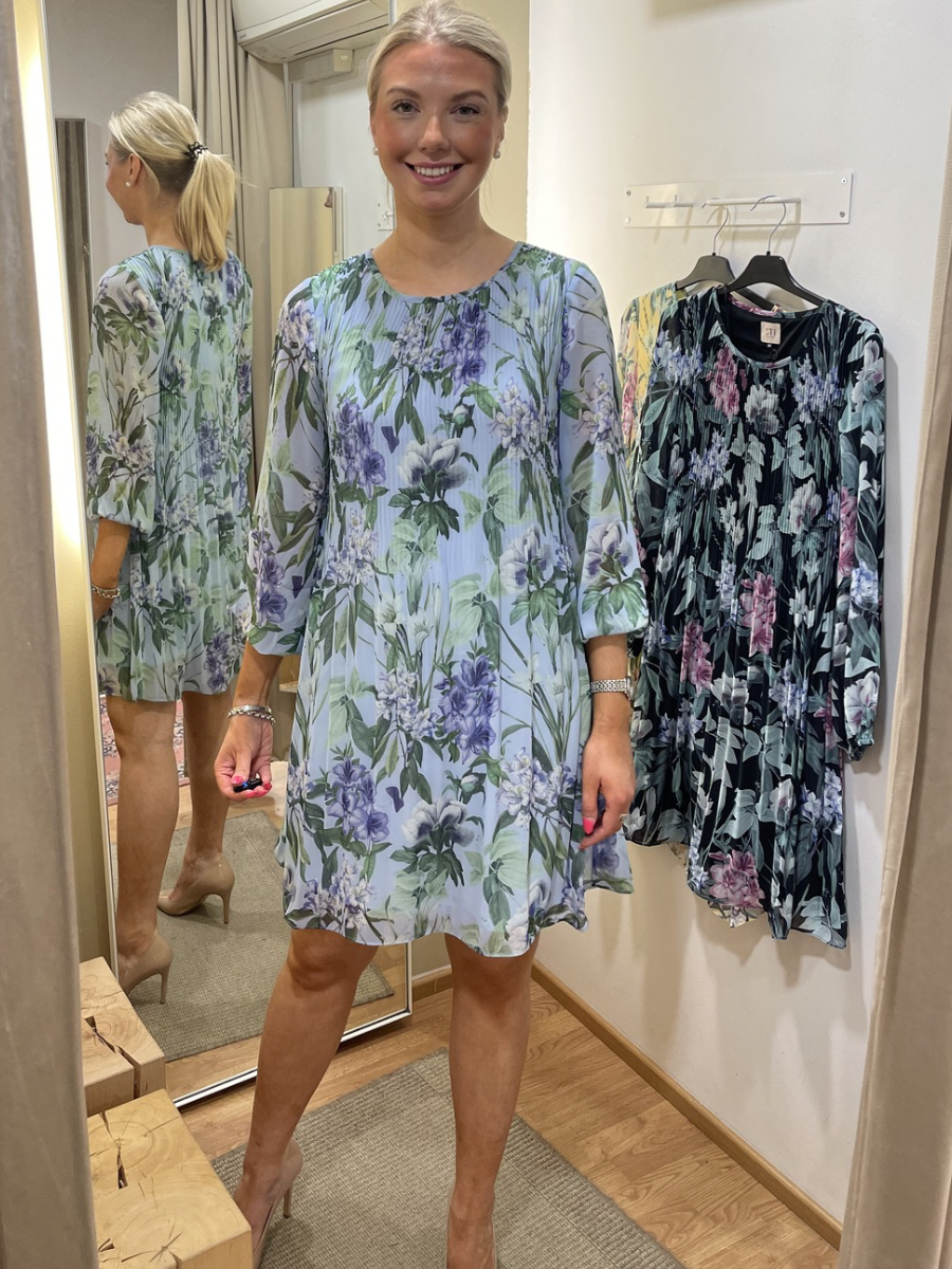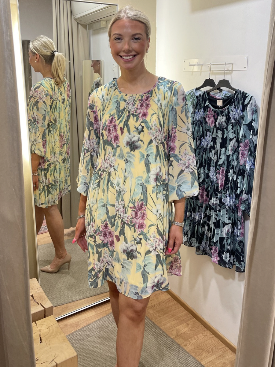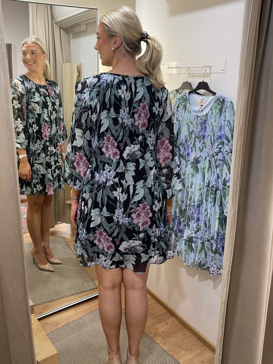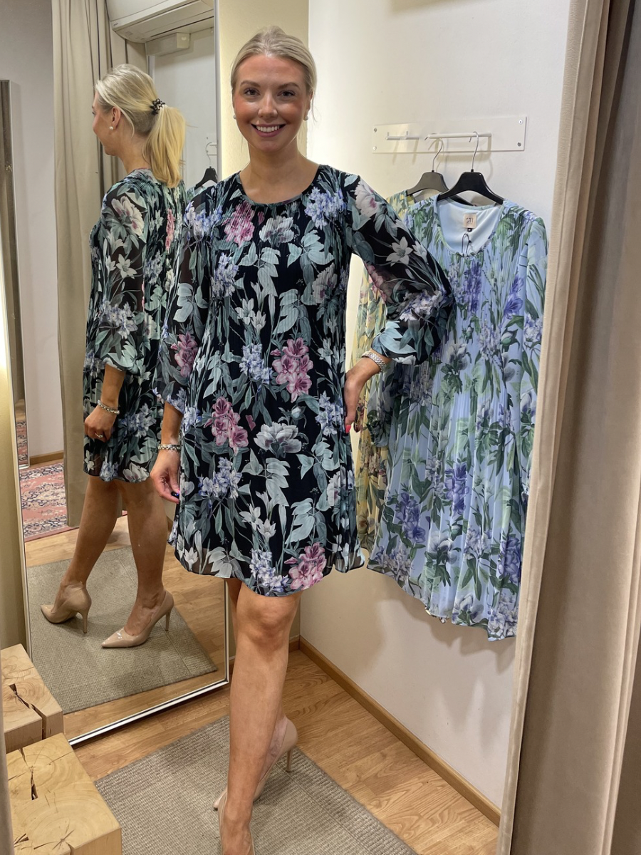 Tämä sifonkinen juhlamekko on täydellinen valinta juhlahetkiin. Pliseerattu materiaali laskeutuu kauniisti ja tuo liikettä asuun, kun taas läpikuultavat pitkät hihat lisäävät keveyttä ja hienostuneisuutta. Hihojen kuminauhat viimeistelevät ilmeen pehmeällä tavalla. Mekko on kauttaaltaan vuoritettu, mikä lisää käyttömukavuutta ja tekee siitä huolettoman valinnan juhliin.
