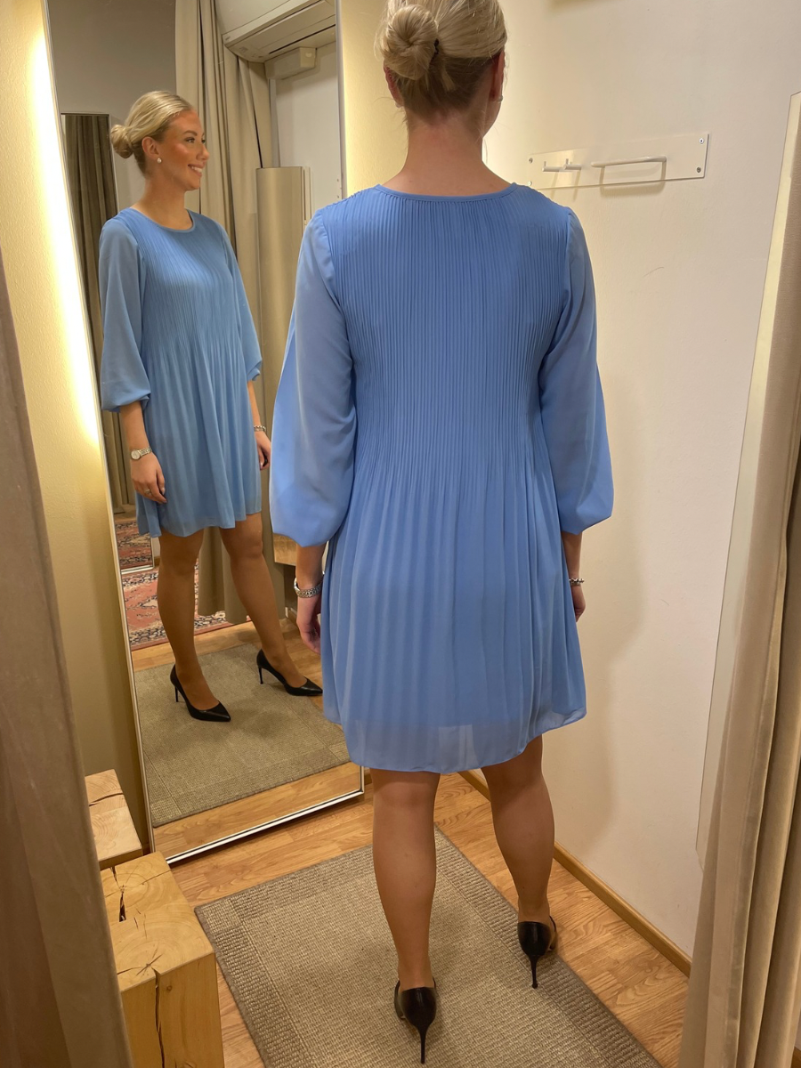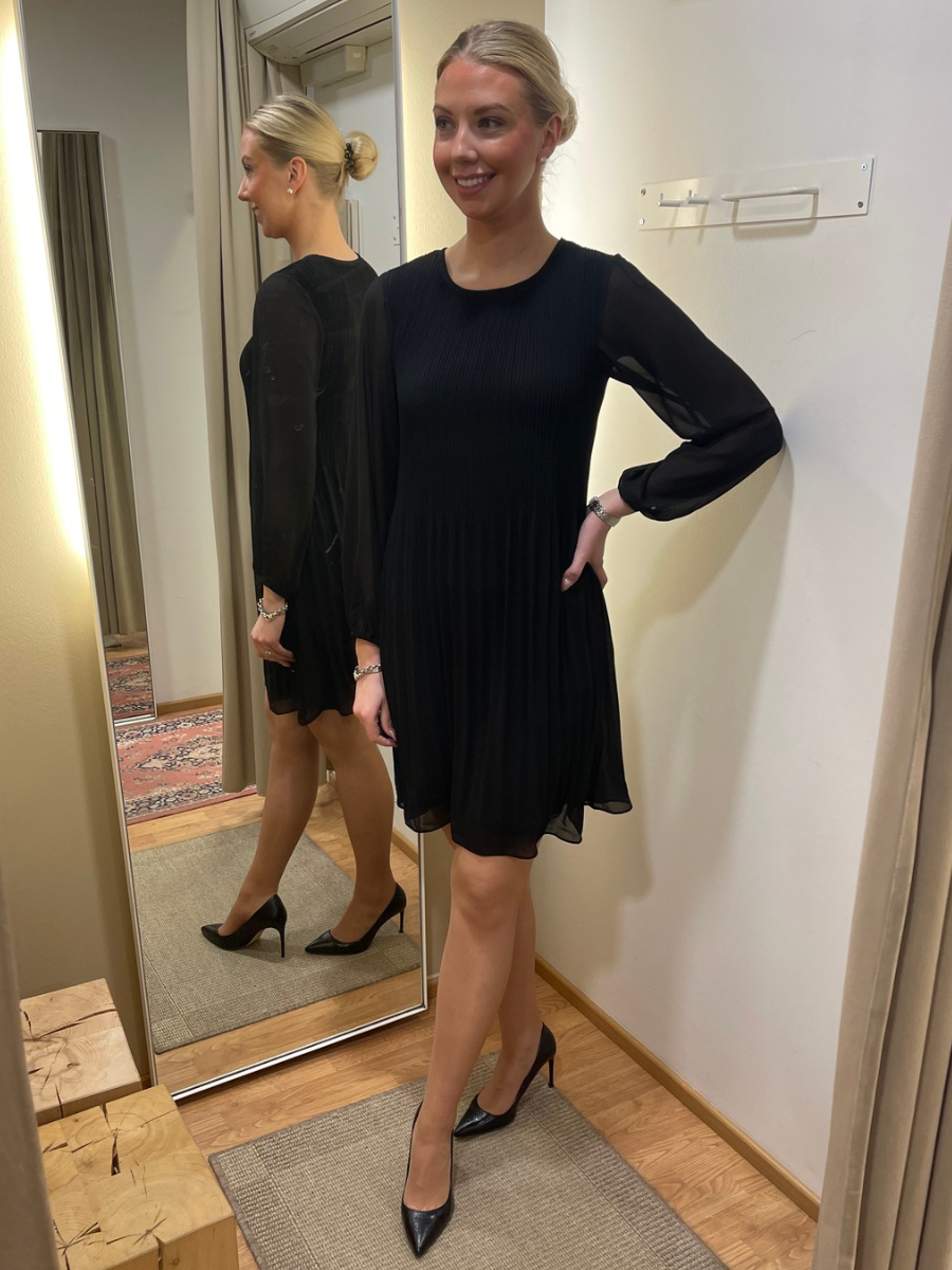 Tämä sifonkinen juhlamekko on täydellinen valinta juhlahetkiin. Pliseerattu materiaali laskeutuu kauniisti ja tuo liikettä asuun, kun taas läpikuultavat pitkät hihat lisäävät keveyttä ja hienostuneisuutta. Hihojen kuminauhat viimeistelevät ilmeen pehmeällä tavalla. Mekko on kauttaaltaan vuoritettu, mikä lisää käyttömukavuutta ja tekee siitä huolettoman valinnan juhliin.