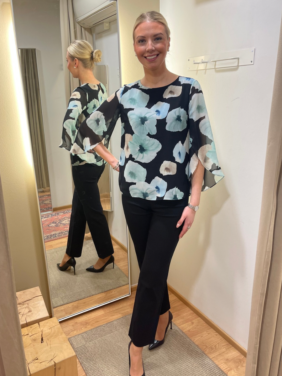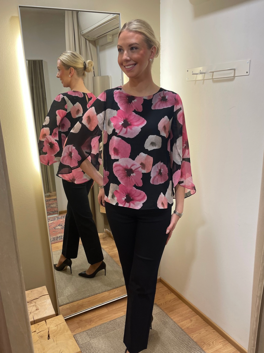 Juhlava sifonkipusero, jossa on kaunis kukkakuosi. Puserossa on kauniisti laskeutuvat, hieman läpikuultavat 3/4-hihat. Puserossa on pyöreä pääntie.