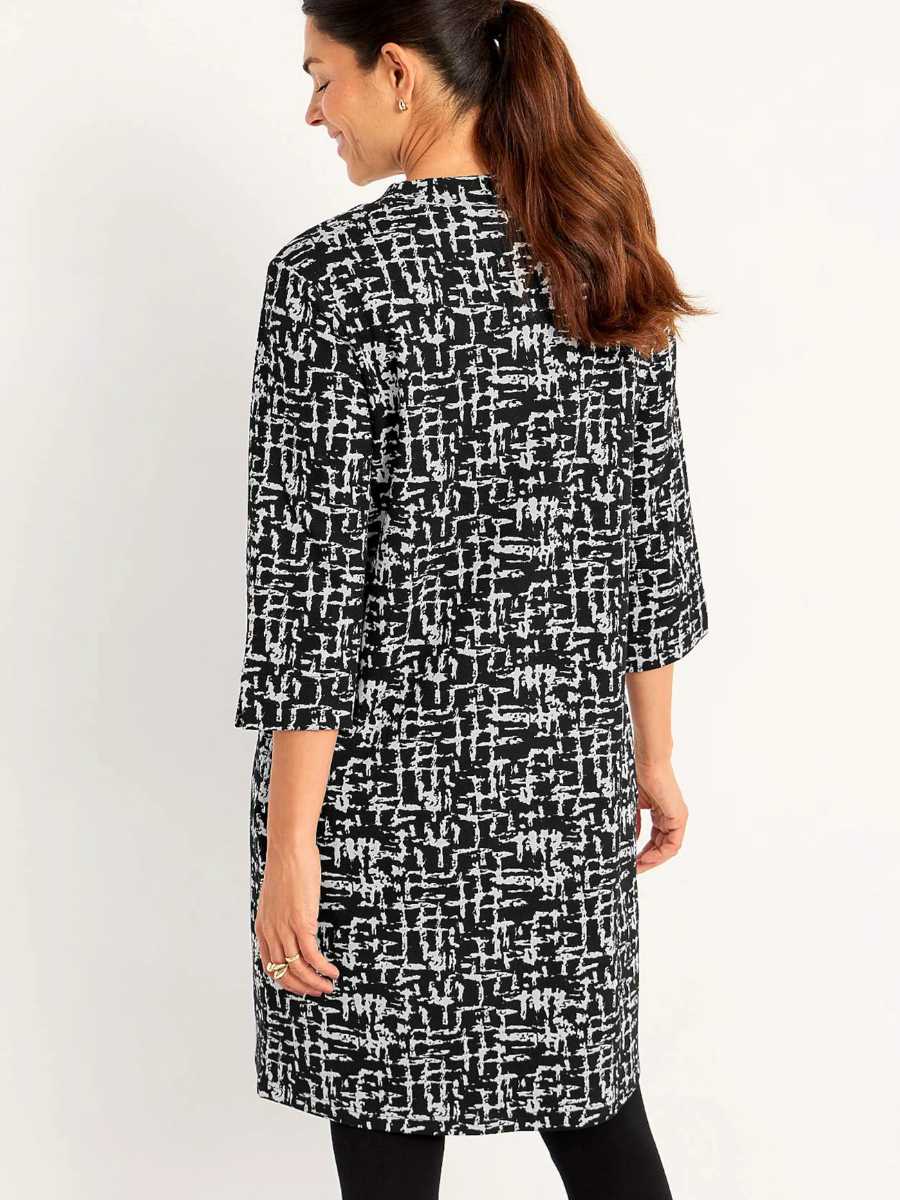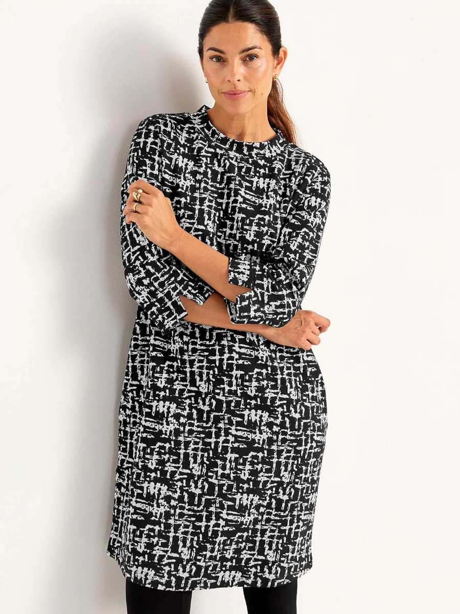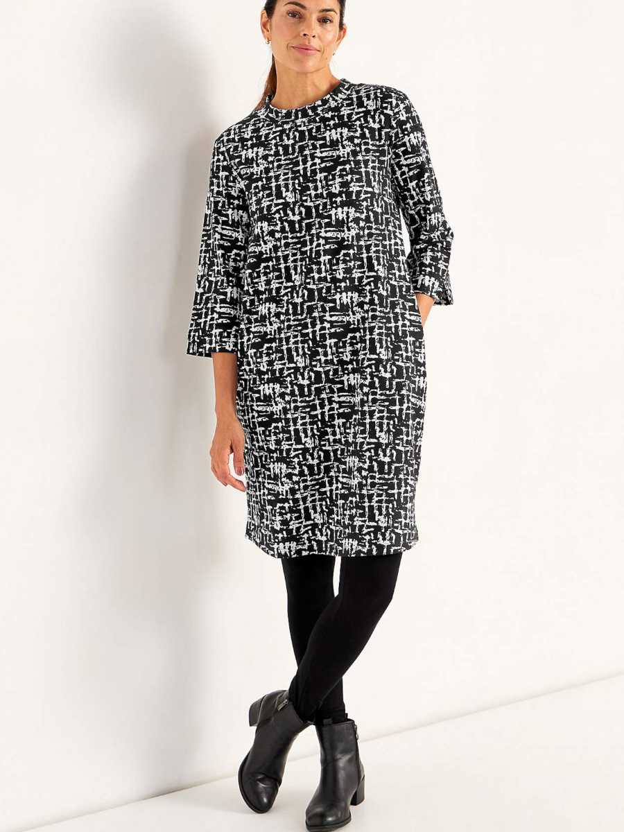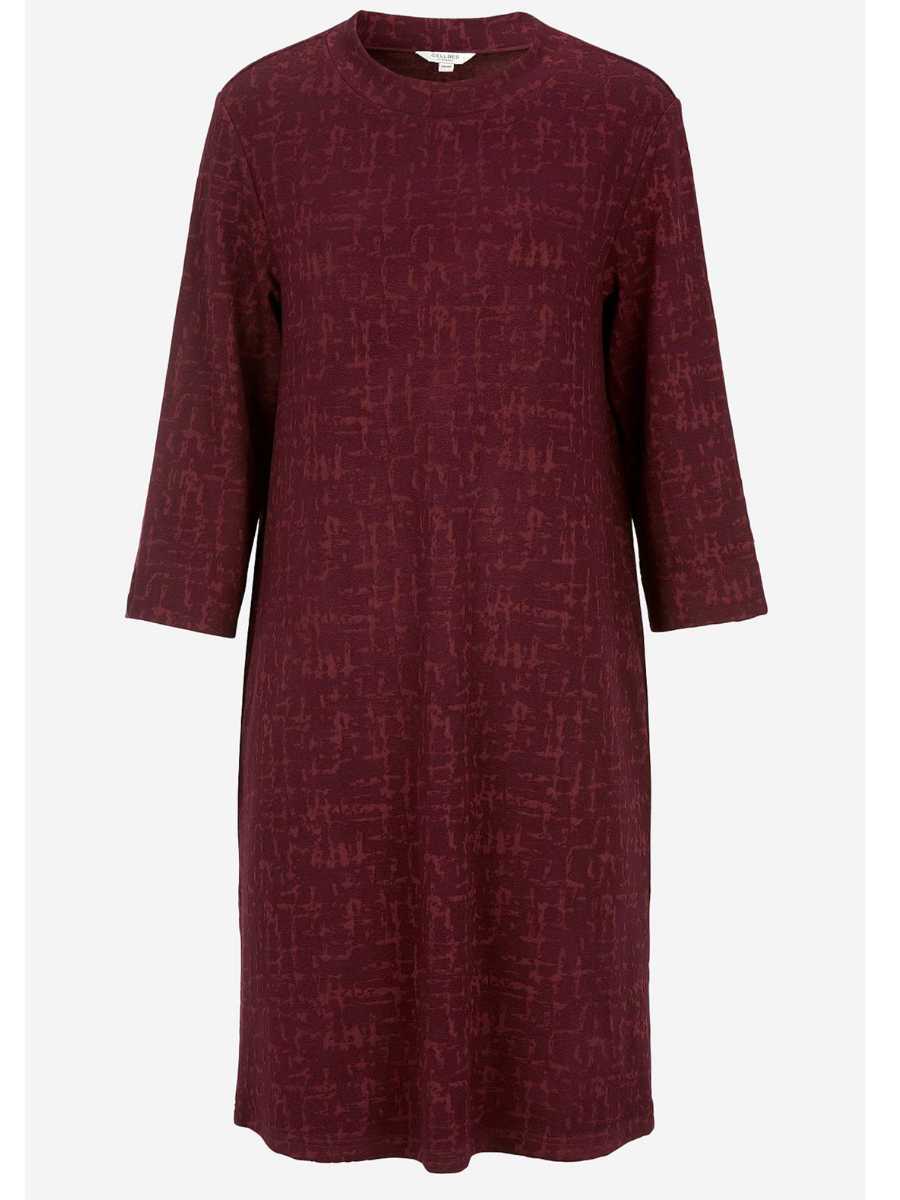 Raskaasta ja joustavasta jerseylaadusta valmistettu mekko, jossa on tyylikäs rakennekuvio. Suora istuvuus tekee mallista mukavan ja ajattoman. Sivusaumoihin sijoitetut taskut lisäävät käytännöllisyyttä, ja pyöreä pääntie tuo ilmeeseen selkeyttä. 3/4-pituiset hihat ja suora helma viimeistelevät kokonaisuuden. Pituus olkapäältä mitattuna on koosta riippuen noin 97–106 cm.