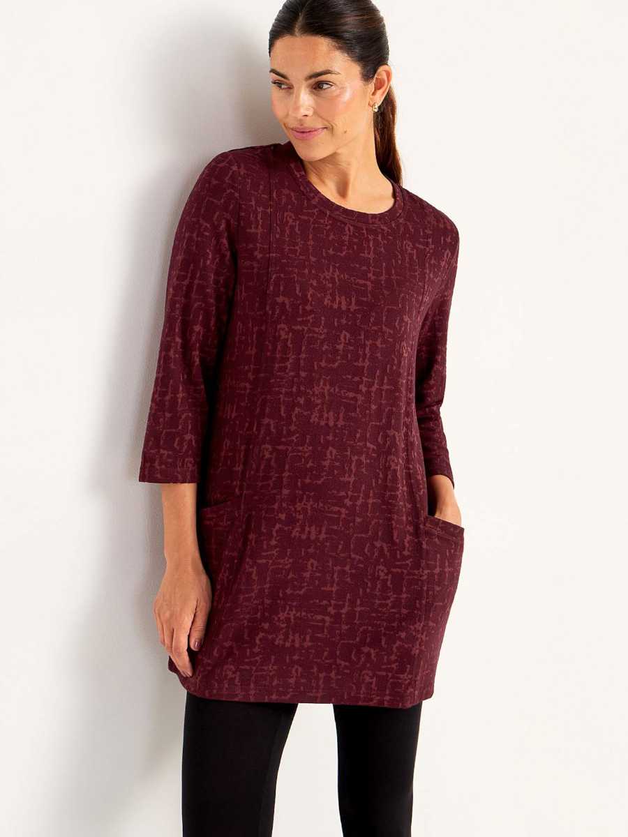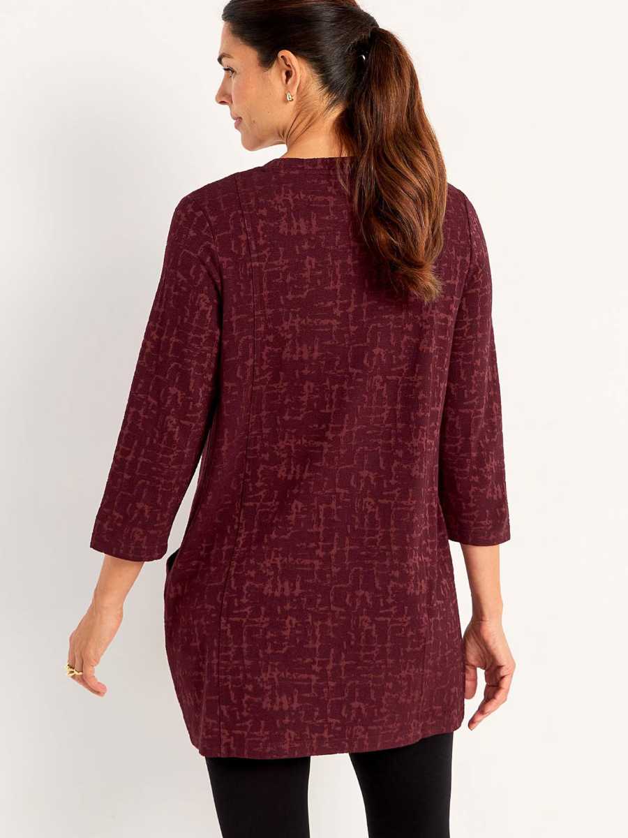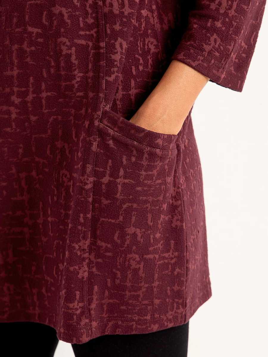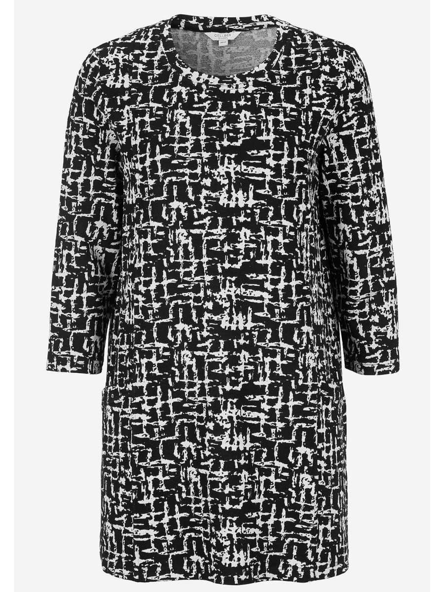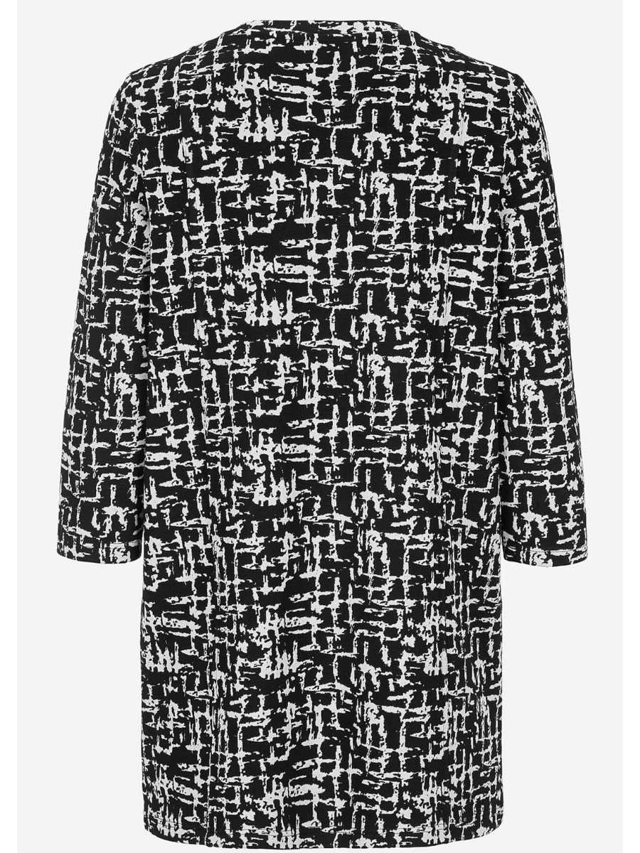 Raskaasta ja joustavasta jerseylaadusta valmistettu yläosa, jossa on kaunis rakennekuvio. Suora istuvuus tekee mallista mukavan ja ajattoman. Pyöreä pääntie ja etutaskut lisäävät käytännöllisyyttä, ja edessä olevat koristesaumat tuovat ilmeeseen ryhtiä. 3/4-pituiset hihat ja suora helma viimeistelevät kokonaisuuden. Pituus olkapäältä mitattuna on koosta riippuen noin 79–86 cm.