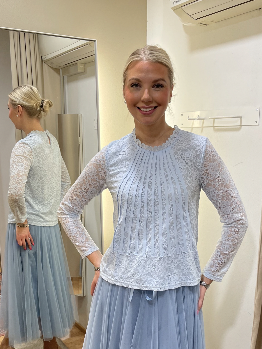 Pehmeä ja naisellinen pitsipusero, joka tuo asuun keveyttä ja viimeistelyä.