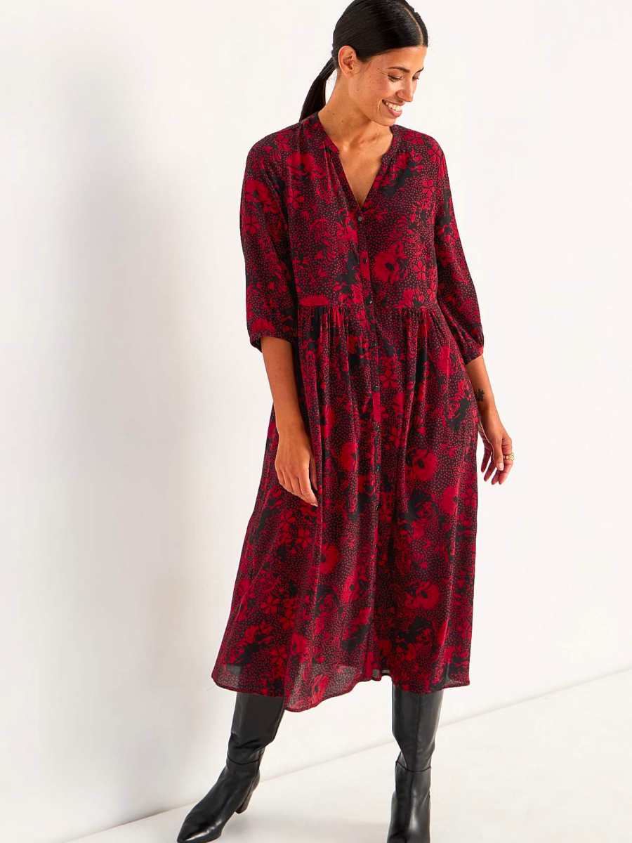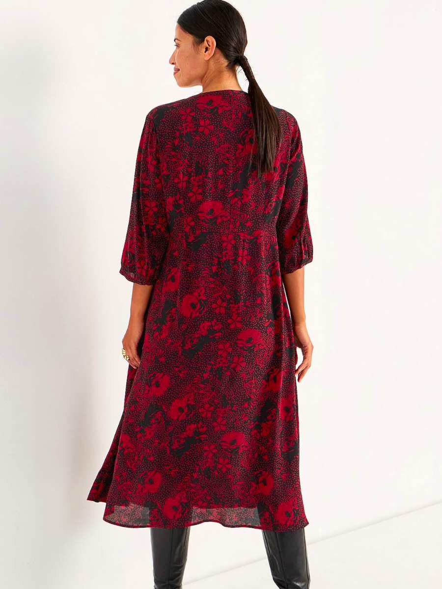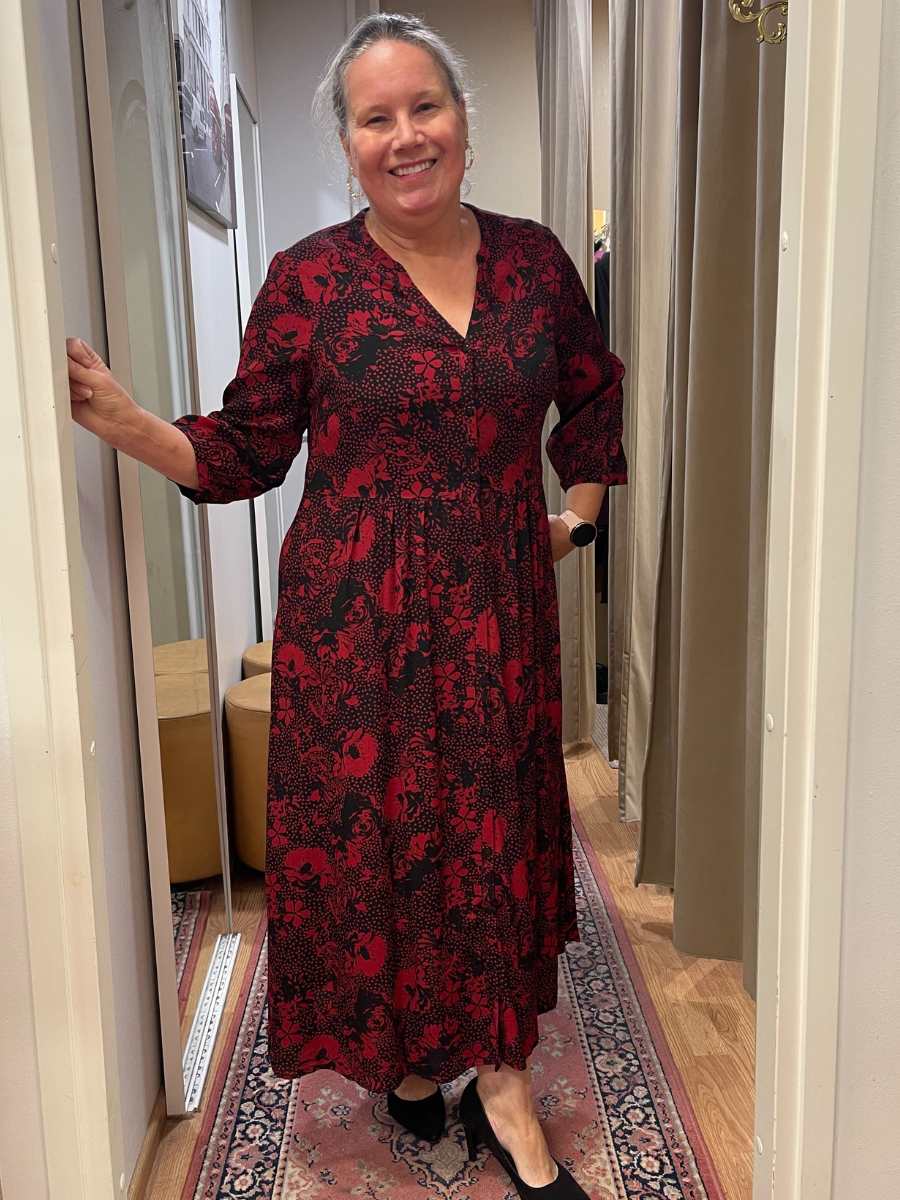Mekko on valmistettu viileästä viskoosista, joka laskeutuu kauniisti. Siinä on A-linjainen siluetti, vyötäröllä sauma ja tyylikkäät laskokset. Mekossa on nappikiinnitys, V-kaula-aukko sekä laskos rintamuksessa. Hihat ovat 3/4-pituiset ja hihansuissa on nappi sekä kapea kalvosin. Mekon pituus olkapäältä on koosta riippuen noin 120–136 cm.